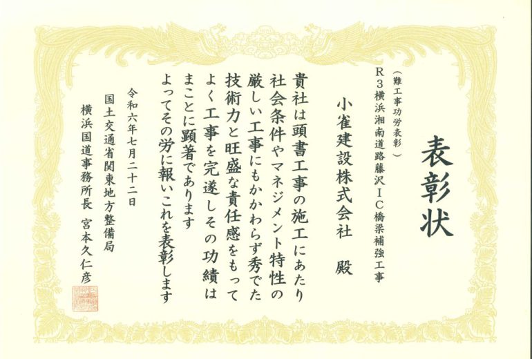 鎌倉市の「鎌倉パブリックカントリークラブ」にて当社社員総勢25名に参加いただき開催しました。 プレーを通じて楽しく社員同士の親睦を深めることがことができました。 東京電力 安全表彰(感謝状)受賞 前の記事 国土交通省関東地方整備局 横浜国道事務所長より感謝状をいただきました。 次の記事