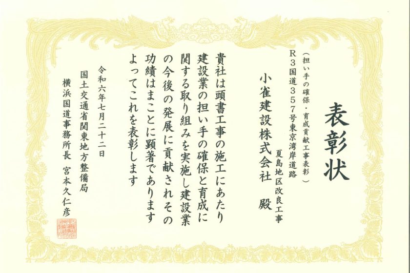 国土交通省 関東地方整備局 横浜国道事務所長 宮本久仁彦様より「担い手確保・育成貢献工事表彰」を受賞しました。 国土交通省 関東地方整備局 相武国道事務所長より建設業担い手確保・育成貢献工事表彰を受賞しました。 前の記事 国土交通省関東地方整備局長及び国土交通省横浜国道事務所長表彰を同時受賞しました。 次の記事