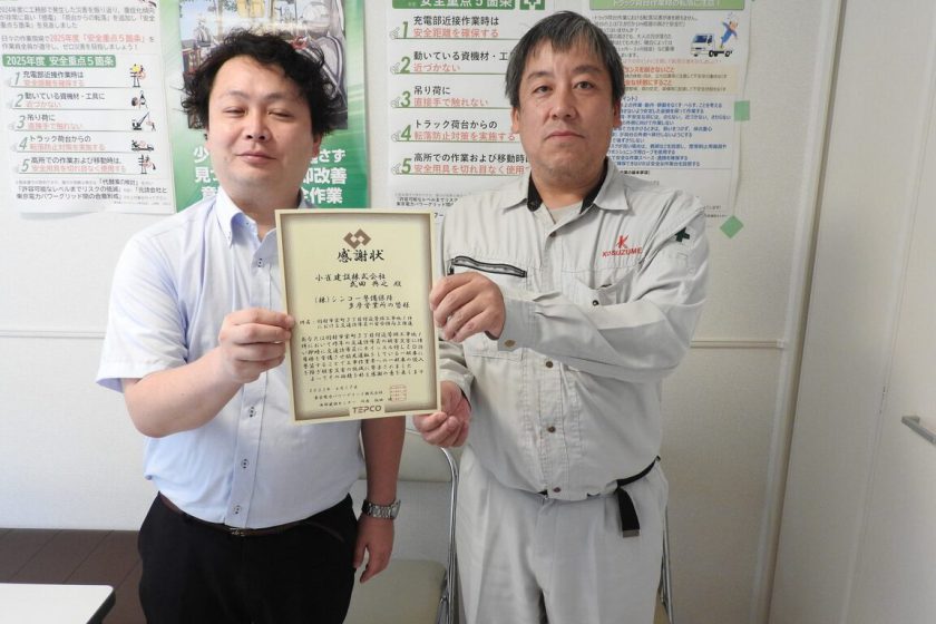 令和7年6月17日に東京電力パワーグリッド株式会社 西武建設センター 所長飯田様より交通誘導員の安全性向上推進として感謝状をいただきました。 建設業労働災害防止協会より表彰状をいただきました。 前の記事 静岡市大浜公園プールがリニューアルオープンします。 次の記事