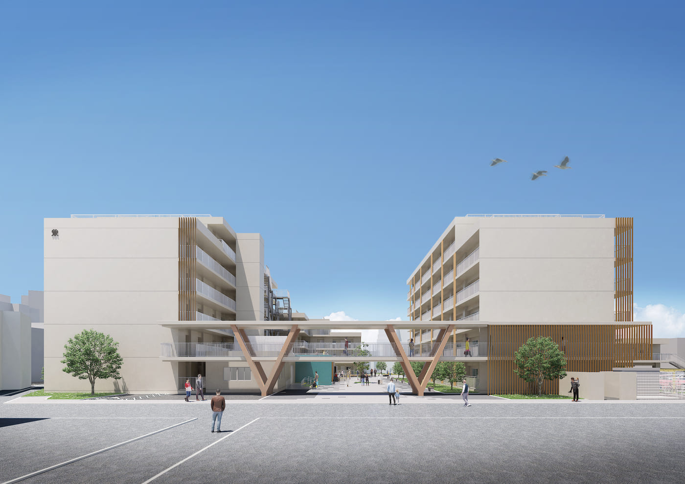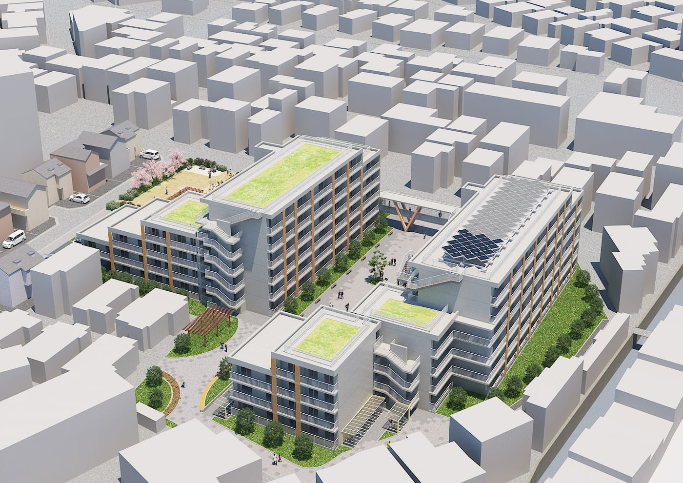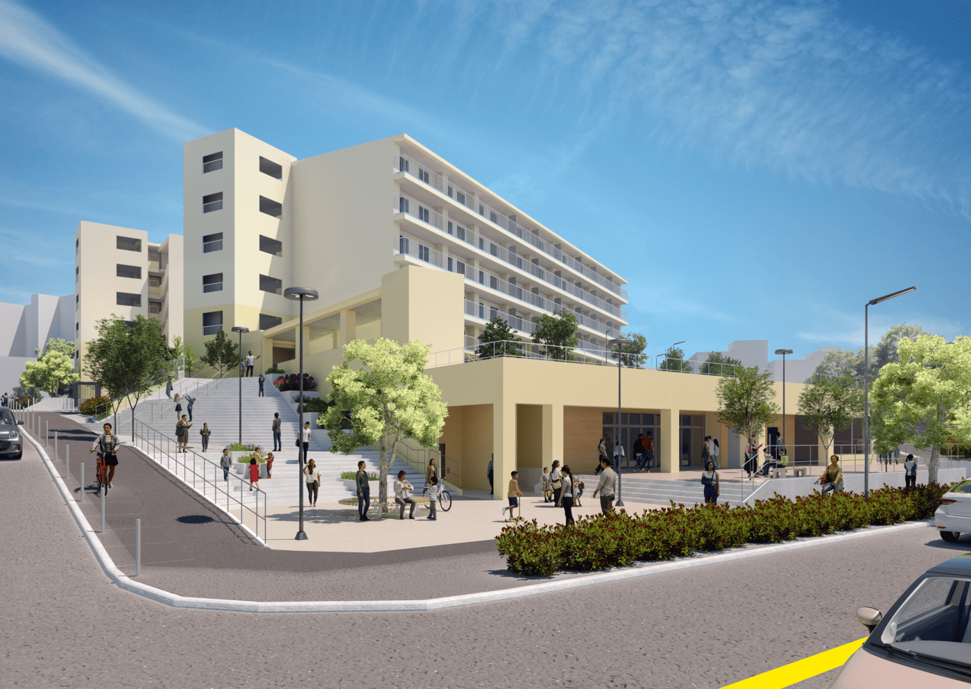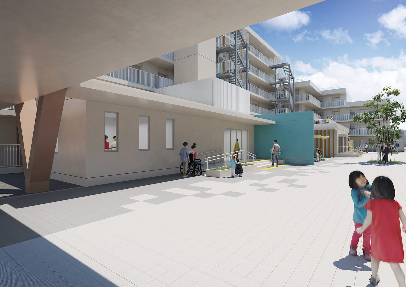 横浜市で初めてPFI(BTa)方式を採用した市営住宅の建替事業を、小雀建設が代表企業として推進しています。老朽化した住宅を安全で快適な住環境へ再生するため、設計・施工・入居者移転支援業務を一体的に実施。地域がかかえるコミュニティの希薄化を改善すべく、日常生活の中で自然にコミュニケーションが生まれる仕組みを取り入れています。さらに市内企業の参画推進に取り組み、地域経済の発展にも寄与します。