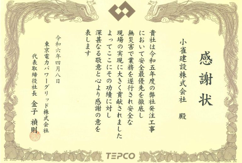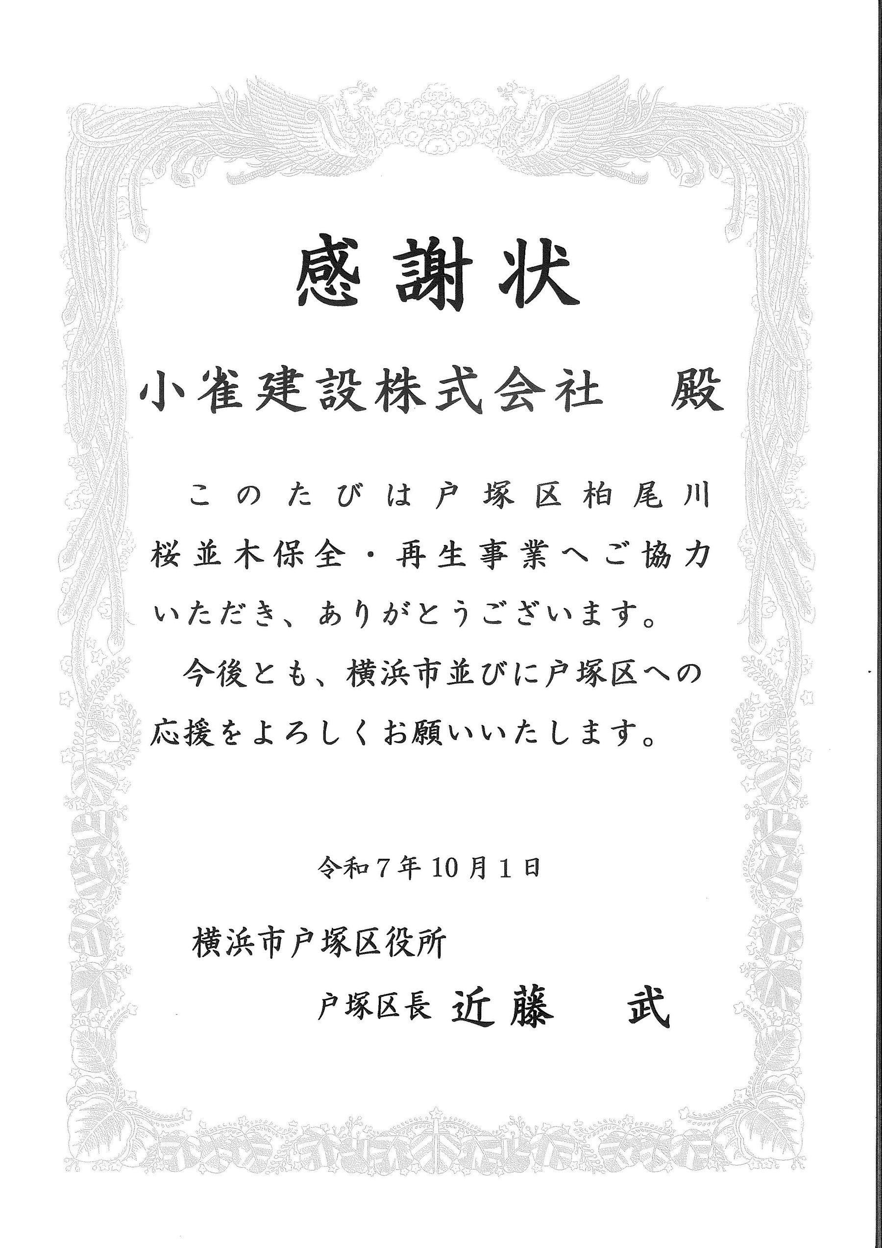 国土交通省 関東地方整備局 横浜国道事務所長より表彰状をいただきました。