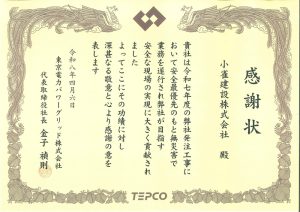 令和八年四月六日に東京電力パワーグリッド株式会社 代表取締役金子様より令和7年度の感謝状をいただきました。 都市計画道路川崎町田線(恩田地区)開通記念式典が行われました。 前の記事 神奈川県優良産業人表彰をいただきました。 次の記事